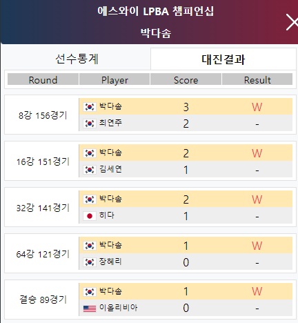 1.6. 박다솜 당구 선수 LPBA 투어 우승 기록