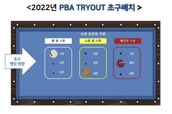 PBA 트라이아웃 초구 배치 : 힌 공 스팟 1번 위치, 노란공 스팟 6번 위치, 빨간공 스팟 8번 위치에 놓고 초구 공격자가 힌공으로 공략합니다.