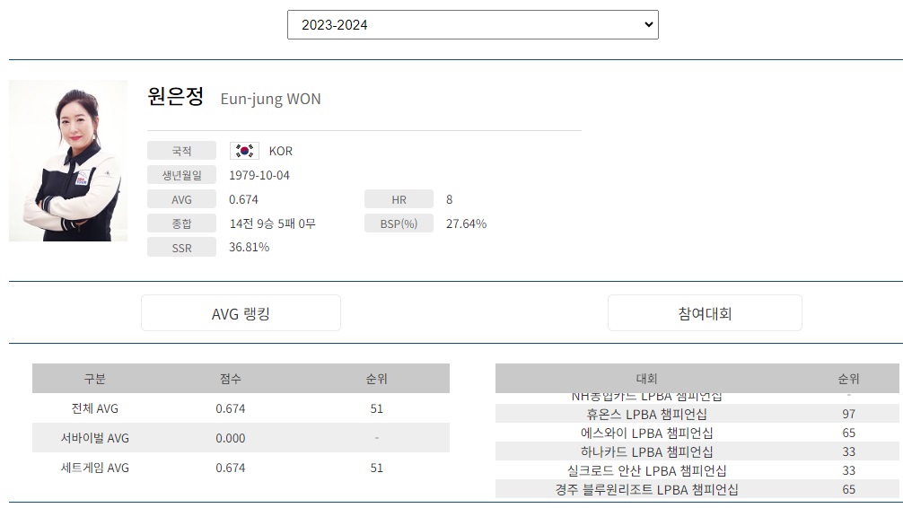 원은정 당구선수의 나이는(출생 연도) 1979년 10월생입니다. LPBA 선수가운데 19070년 출생은 김갑선, 이마리, 김경자, 히다 오리에, 김갑선 선수 정도를 꼽고 있었는데 원은정 선수가 또 있는 줄 몰랐습니다. 그만큼 당구 베테랑이라는 의미일 것입니다. LPBA 원은정 당구 선수의 매 시즌별 당구 프로필을 간략히 살펴보았습니다.