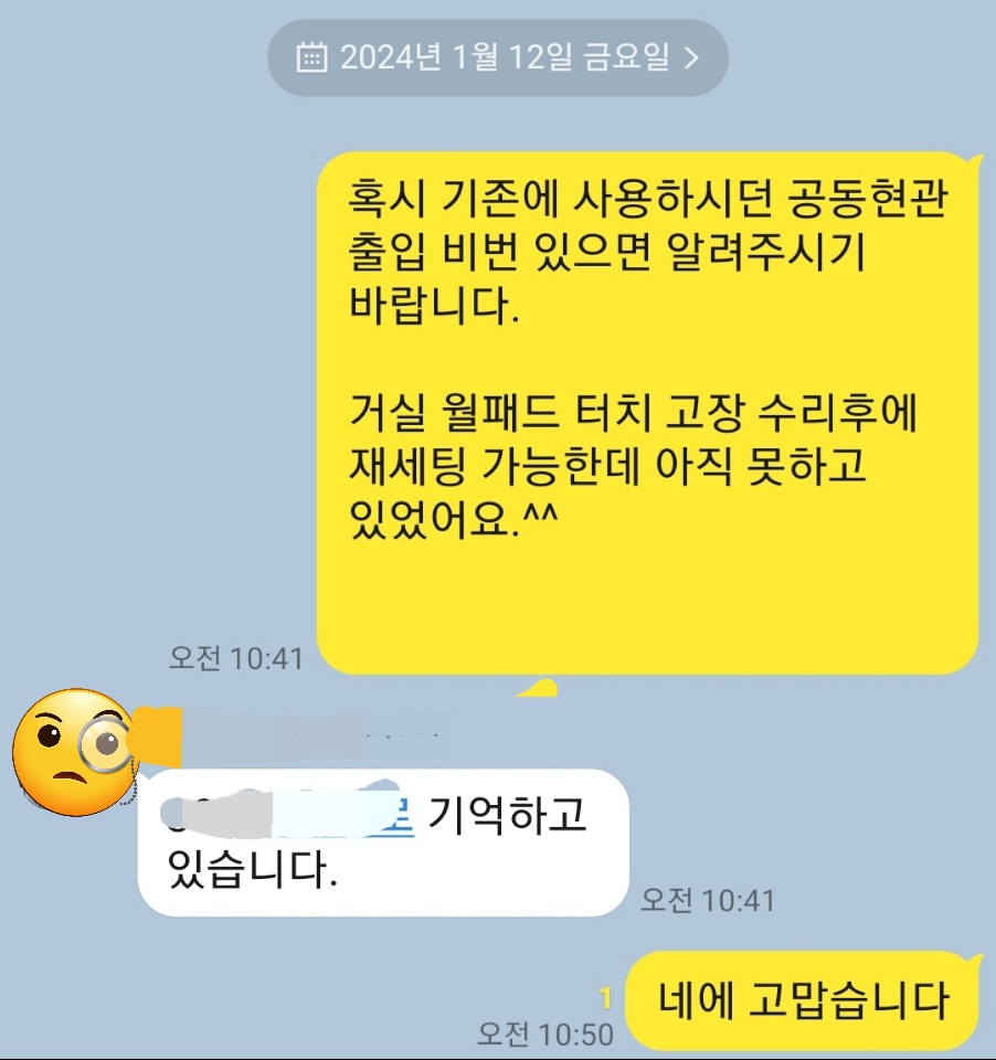 "혹시 기존에 사용하시던 공동현관 출입 비번 있으면 알려주시기 바랍니다. 거실 월패드 터치 고장 수리후에 재세팅 가능한데 아직 못하고 있었어요."