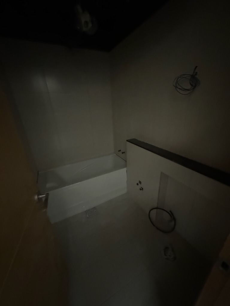 어두어 잘 안보이지 않지만 안반 욕실입니다. 타일 작업을 마무리한 상태입니다. 욕조도 새로운 것으로 바꾸었습니다. 욕실장과 변기, 세면기는 아직 설치되지 않았습니다,