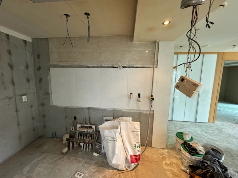 가운데 부분이 주방의 타일 작업부분입니다. 주방 타일공간을 제외한 공간에는 싱크대가 설치될 부분입니다. 천장에 매달려있는 기계는 주방TV인 것 같습니다.