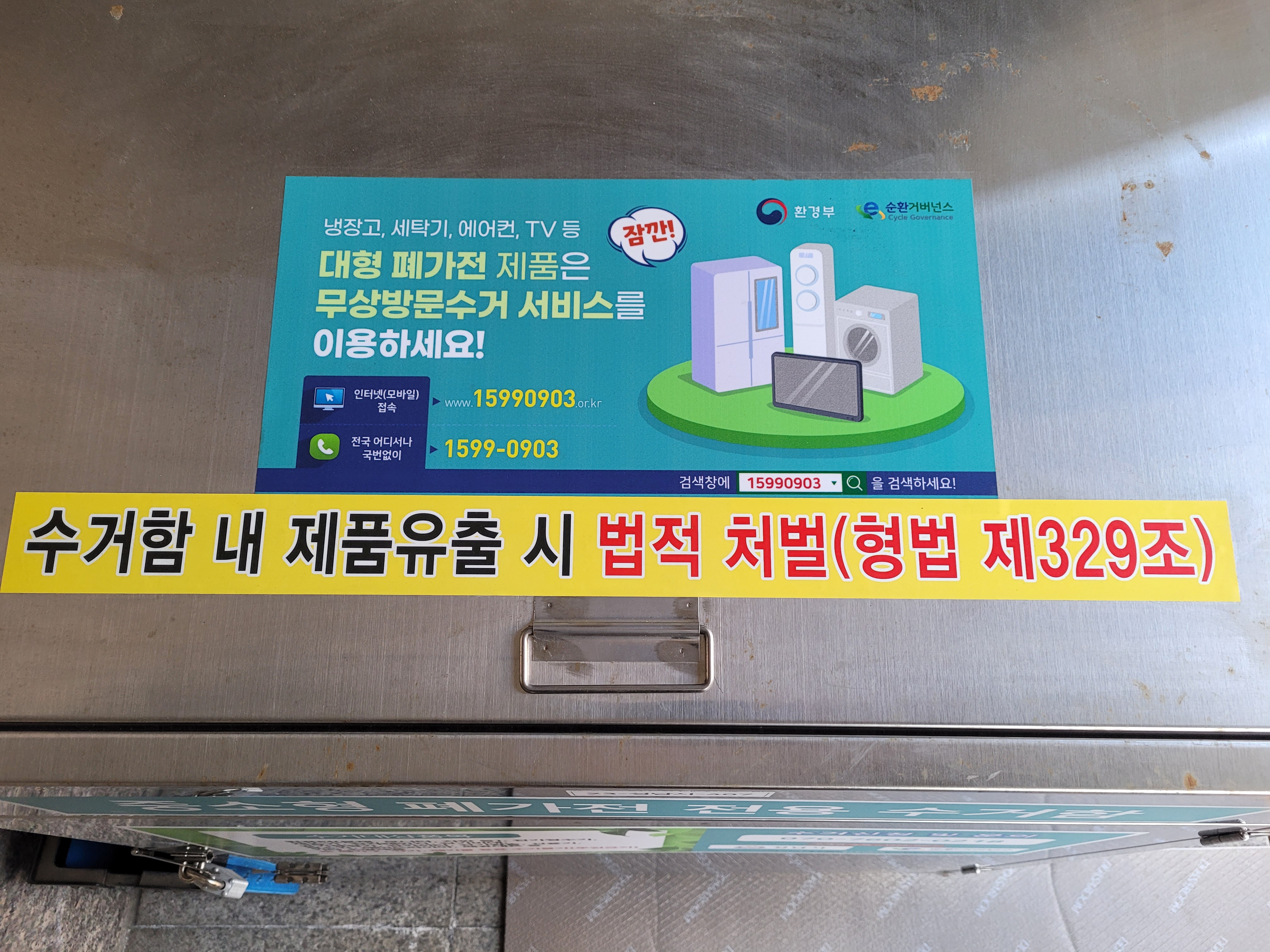 또한 중소형 폐가전이 아닌 냉장고, 에어컨, 세탁기, TV 등 대형 가전 제품임으로 수거함이 넣지말고 별도의 무상 방문 수거 서비스를 이용해야합니다.
