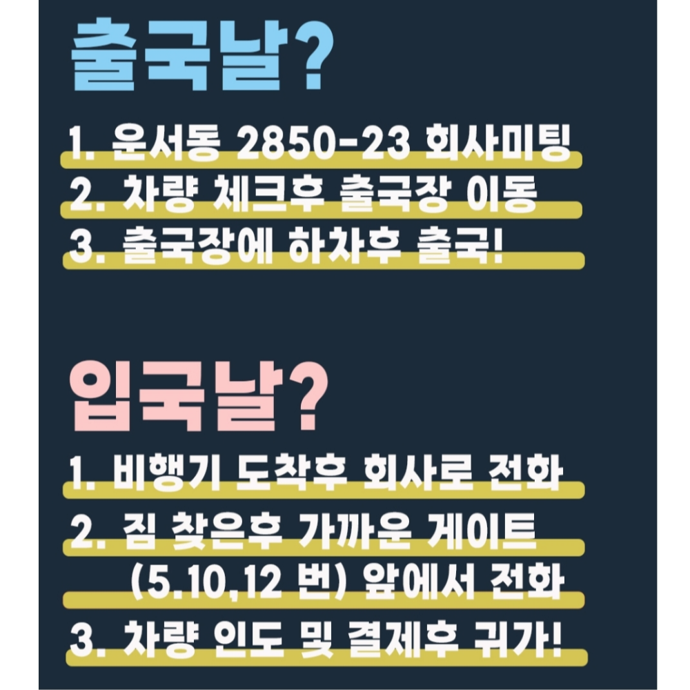 해외여행이나 출장으로 인천공항 근처의 장기주차 대행서비스 주차장을 처음 이용한다면, 출국날과 입국날 어떻게 내 차를 전달하고 다시 돼찾는지에 대한 방법을 사전에 명확하게 확인하는 것이 중요합니다.