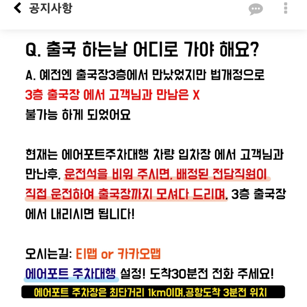 이제는 에어포트 주차대행 차량 입차장에서 고객과 만나고 있다고 합니다. 그곳에서 전담직원이 3층 출국장까지 태워 주는 서비스를 하고 있는 것으로 확인됩니다.