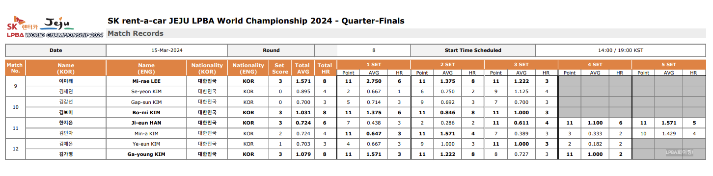 LPBA 월드챔피언십 8강 경기결과 - 경기지표