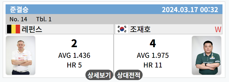 조재호는 레펜스를 4대 2로 제압하고 PBA 월드챔피언십 2024 대회 결승전 마지막 티켓을 잡았습니다. 조재호는 하이런 11점, 애버리지 1.975를 기록하면서 하이런 5점, 애버리지 1.436을 기록하면서 분전한 레펜스를 압도하는 분위기였습니다.