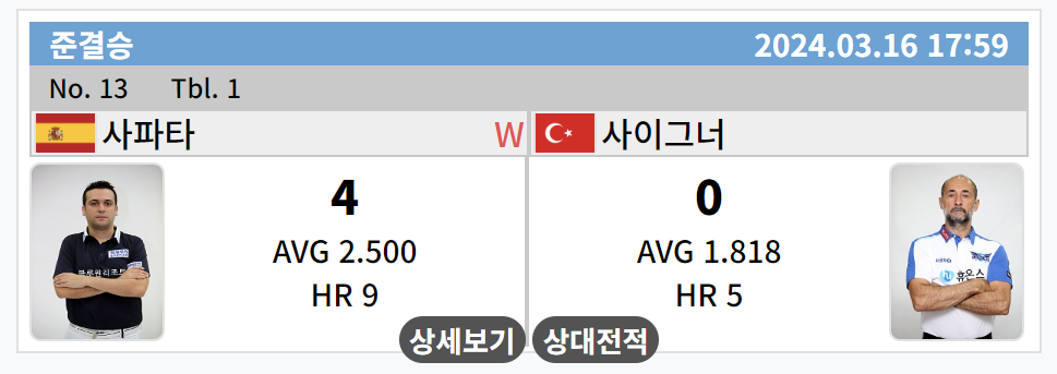 스페인 출신 PBA 3총사를 대표하는 다비드 사파타와 튀르키예의 3쿠션 전설, 세미 사이그너의 4강 준결승 경기결과는 사파타가 사이그너(세이기너라고도 불림)를 세트스코어 4대 0으로 이기면서 결승 대진표에 이름을 올렸습니다.