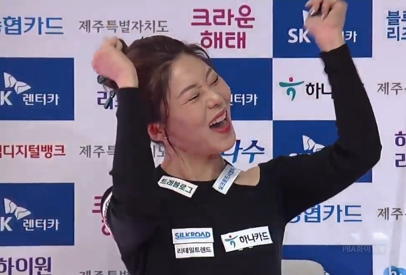 카메라 렌즈에 우승 싸인을 하는 김가영 선수.