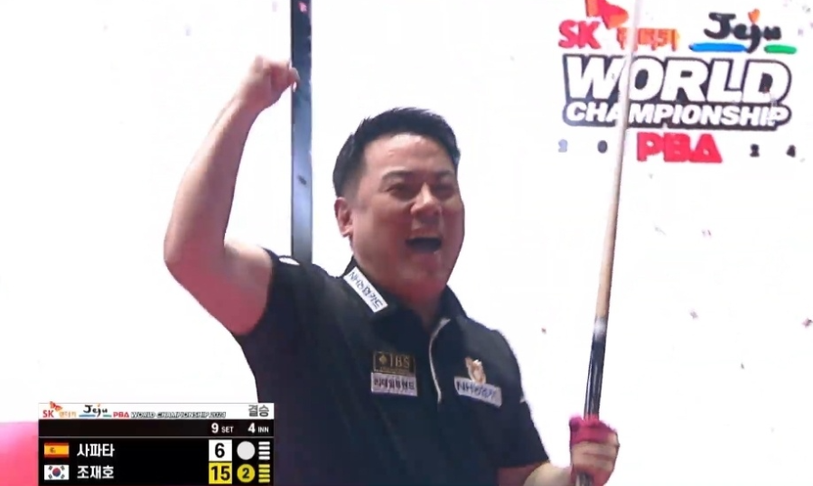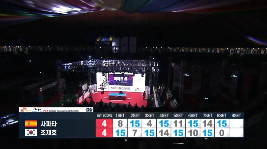 그리고 조재호는 사파타가 6점에 머무르는 동안 마지막 뱅크샷을 성공시키면서 15:6으로 9세트를 이겼습니다.
