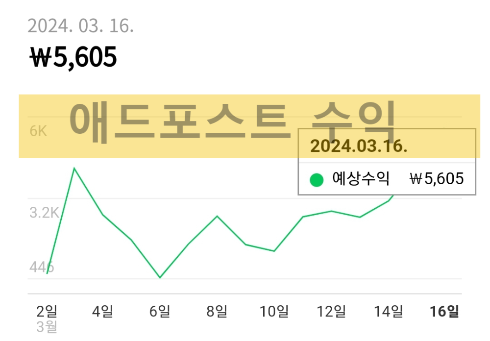 엊그제 3월 16인일 조회수 5천을 넘겼더니 네이버 애드포스트 예상 수익이 5,600원 상당인 것을 알 수 있습니다.