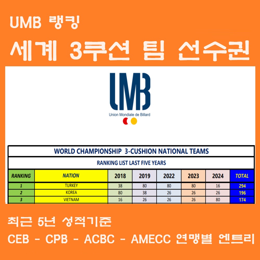 IOC산하에서 캐롬 당구를 관장하는 조직으로 세계당구연맹(세계캐롬연맹)이라고 불리는 UMB(Union Mondiale de Billard)에서는 발표한 세계 3쿠션 팀 선수권대회 랭킹입니다. 한 마디로 팀이란 국가를 의미함으로 3쿠션 국가 랭킹이라고 할 수 있습니다.