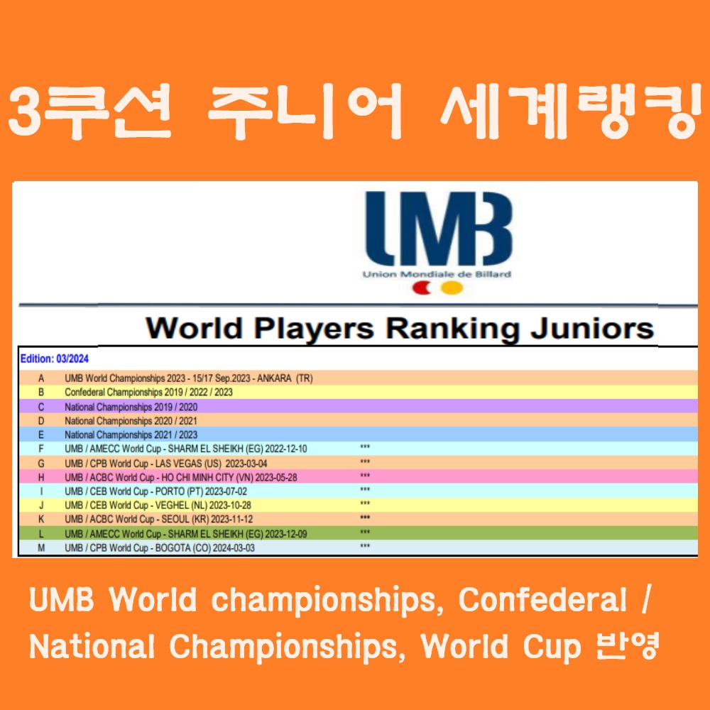 2024년 4월 3일 자로 UMB(세계당구연맹 또는 세계캐롬연맹)가 업데이트 발표하여 공표한 세계 3쿠션 주니어 당구선수 랭킹입니다.