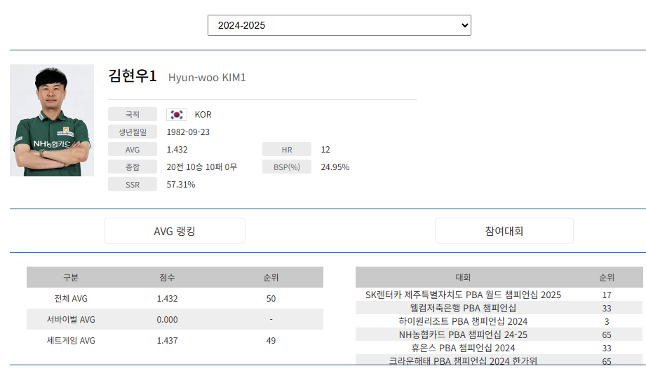 * *출처 : PBA 프로당구협회 선수정보 참고: PBA경기지표는 시즌이 종료된 이후에 최종 업데이트됩니다.