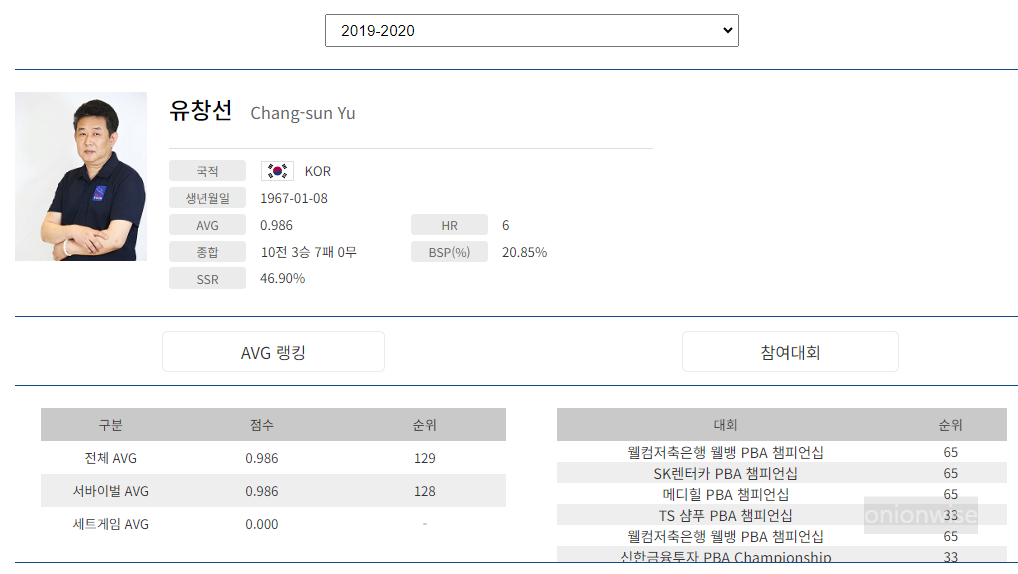1. 프로당구 2019-20시즌, 유창선 당구선수 PBA 경기지표