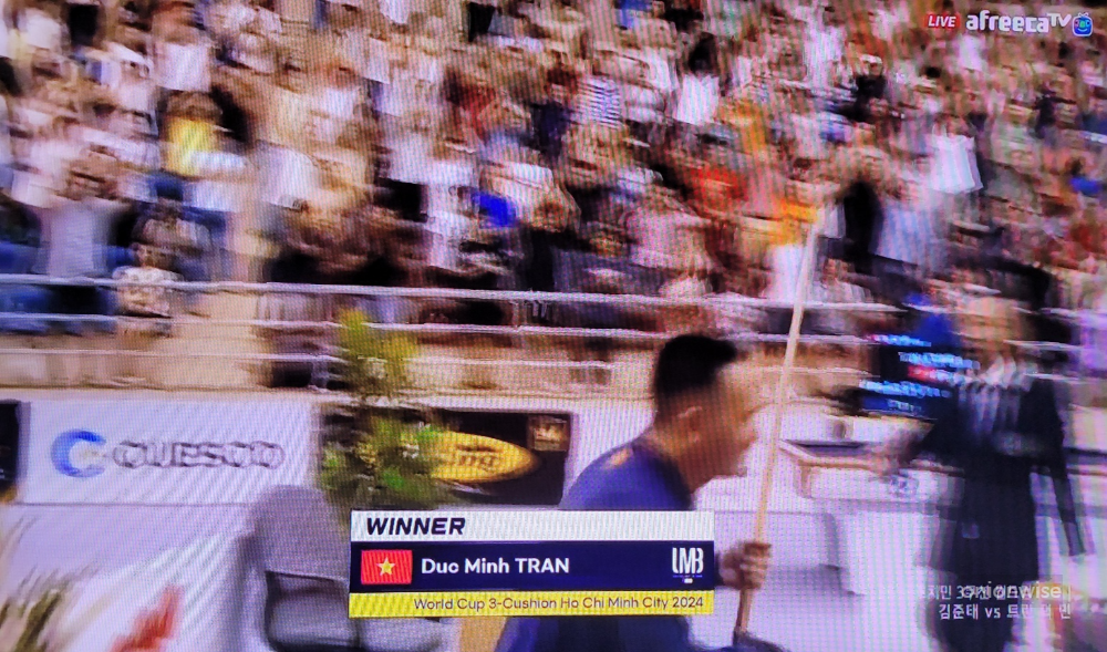 5월 20일부터 시작된 "2024 호치민 세계 3쿠션 당구 월드컵" 대회의 결승, 김준태 vs 트란덕민의 결승전 경기결과가 방금 나왔습니다. 2024 호치민 세계3쿠션 당구 월드컵 대회의 우승자는 베트남의 트란덕민(쩐득민) 선수로 결정되었습니다.