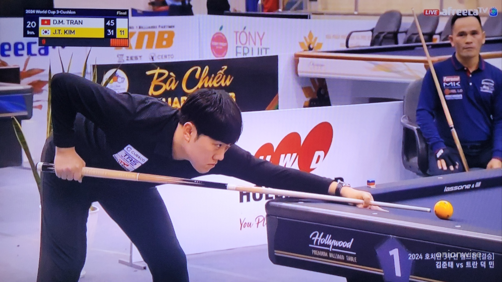 2024 호치민 세계 3쿠션 당구 월드컵 대회 결승에서 만난 김준태와 트란덕민(쩐득민) 선수의 주요 경기장면을 갈무리해 보았습니다. 본 내용은 아프리카 tv 실시간 중계방송 내용을 인용하였습니다.