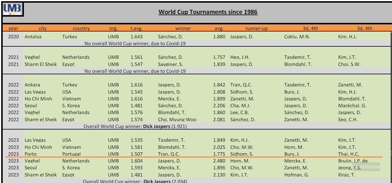 이상, UMB가 개최하고 있는 포르투 세계 3쿠션 당구월드컵 대회의 역대 우승자 현황을 정리했습니다.