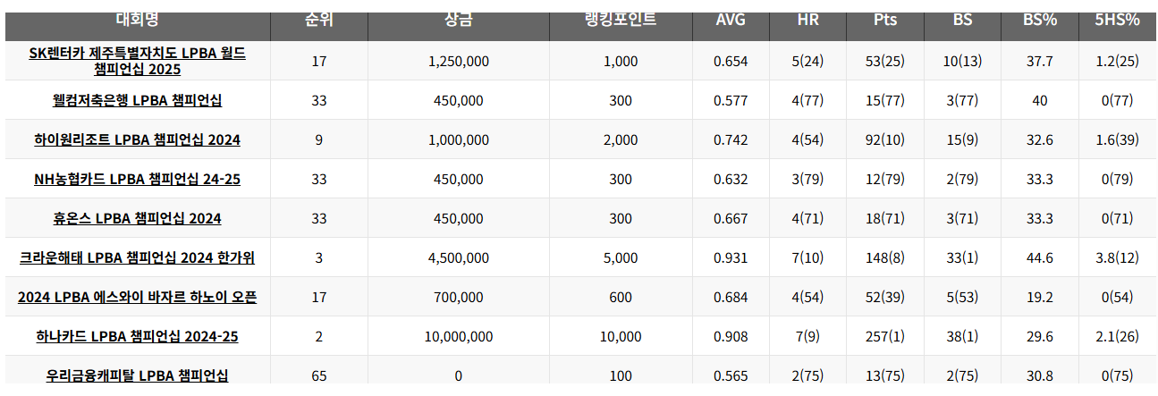 - LPBA통산 누적 상금 랭킹 : 누적 랭킹 33위, 총 상금 2,547만 원 (2025년 8월 4일 기준)