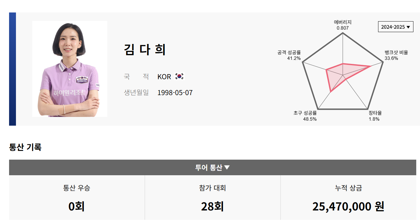6. 프로당구 2024-25시즌 김다희 당구선수 LPBA 경기지표