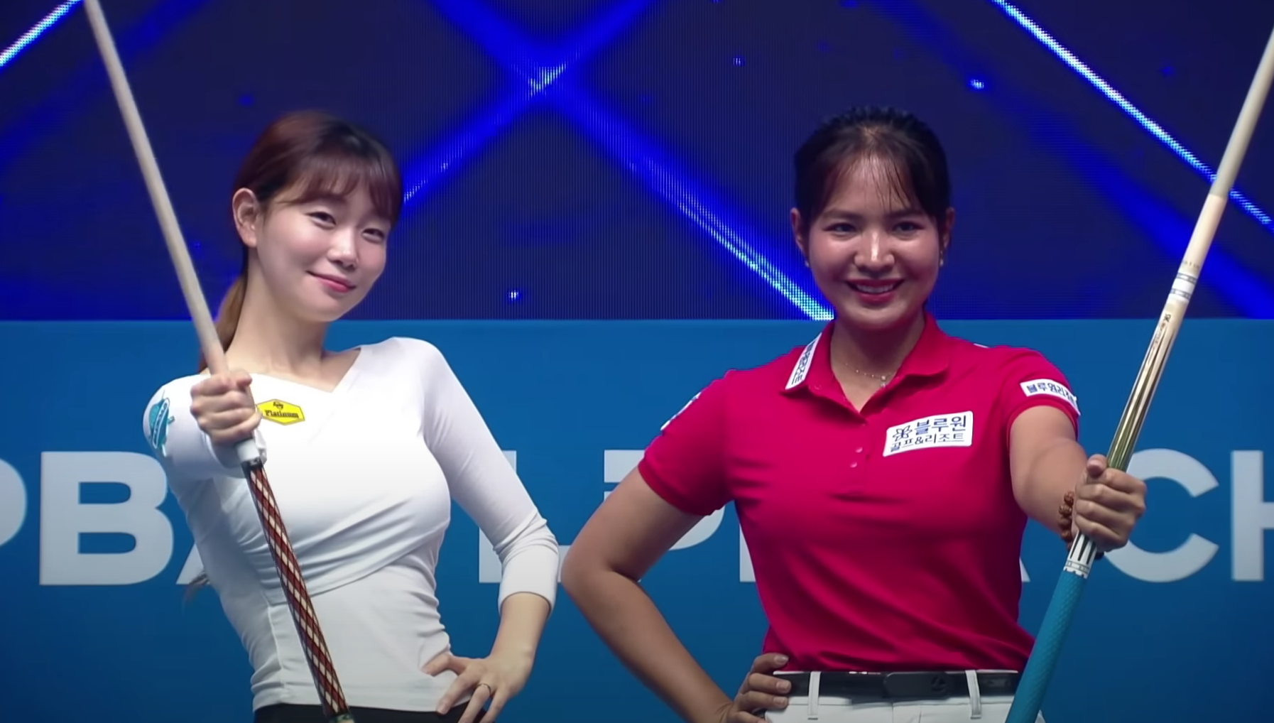 약속한 걸까요? 아니면 카메라 감독이 요청을 한 걸까요? 두 선수가 당구큐를 양옆으로 V자 모양으로 벌리고 멋진 포즈를 취했습니다.