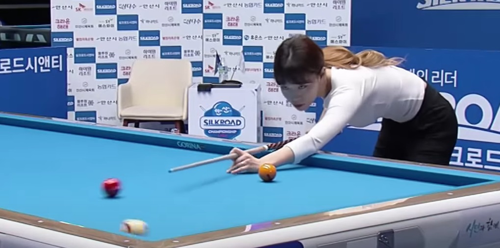 김보라는 다음 순간 제2 목적구인 적구(빨간 공)를 향해 있는 힘껏 샷을 날렸습니다.