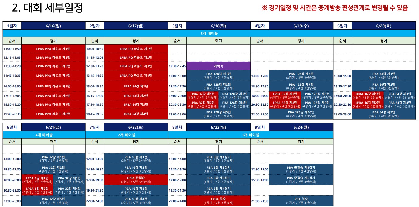 대회일정은 LPBA는 06/16(일) ~ 23(일)이며, PBA는 06/18(화) ~ 24(월)입니다.