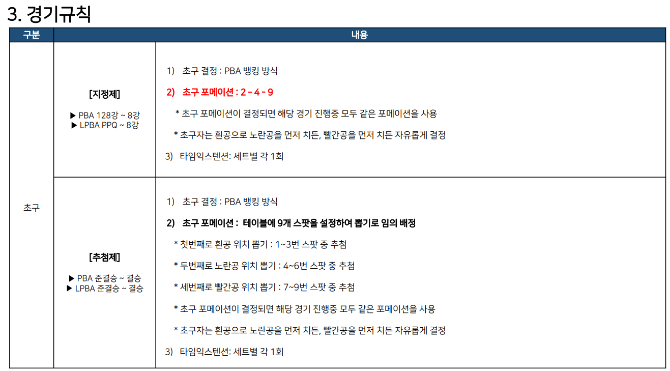 한편 LPBA 점수제에서 초구 결정은 PBA 뱅킹 방식이 적용됩니다. 또 LPBA 점수제의 경기 초구 포메이션은 이번대회에서는 2-5-7 포메이션으로 결정되었습니다.
