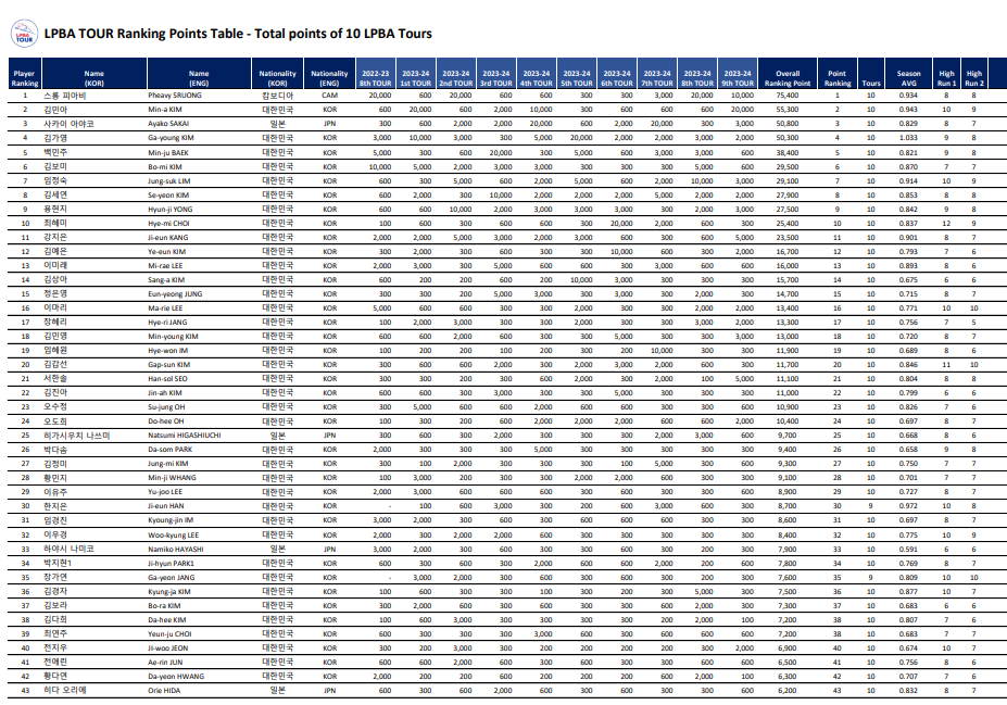 1. (국영문) 2024-25 시즌 LPBA TOUR 합산 포인트 랭킹표(10개 대회)