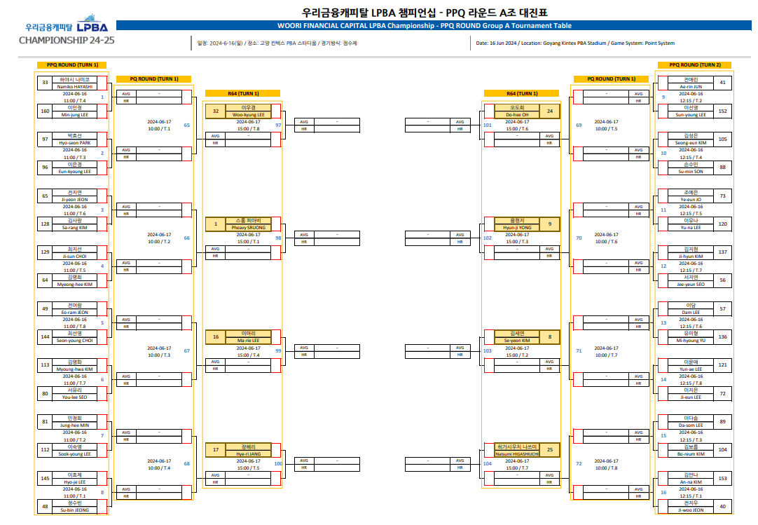 오늘은 PBA 프로당구협회가 PBA 홈페이지를 통해 공지한 프로당구 2024-25 시즌 개막전, 우리금융캐피탈 LPBA 챔피언십 PPQ 라운드 대진표입니다.