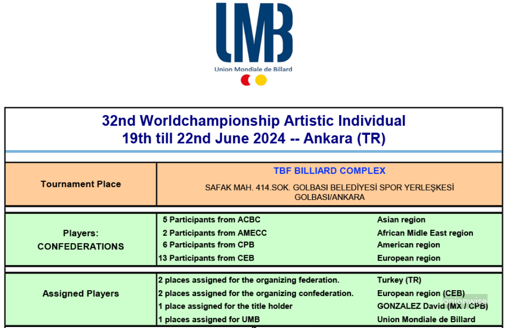 제32회 UMB 세계예술당구대회 (예술당구 세계선수권대회)의 대회는 6월 19일부터 6월 22일까지입니다. 출전 선수는 각 대륙별 시드에 따른 26명과 각 단체의 와일드 카드로 배정된 6명을 합쳐 총 32명입니다.