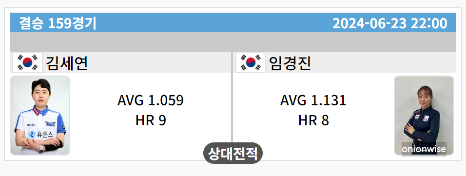 김세연 - 임경진 결승전의 객관적 전력은 김세연이 임경진에 앞서 있습니다. 하지만 결승전까지 보여준 두 선수의 경기력은 정말 팽팽합니다. 특히 임경진은 강력한 우승후보 3명(김민아, 사카이 아아코, 이신영)을 이겼습니다.