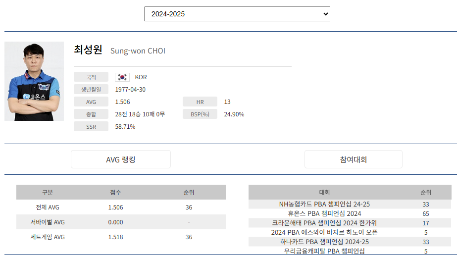 5) 프로당구 2024-25 시즌, 최성원 당구선수 PBA 투어 경기지표