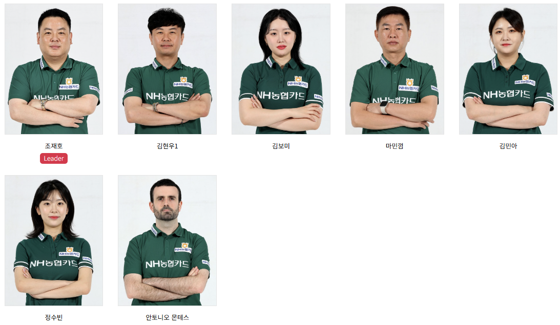 아무튼 NH농협카드 그린포스 당구팀은 창단 원년에 팀 리더를 조재호 선수로 지정하고, 소속 선수는 김현우, 마민캄 (마민껌), 응우엔 프엉린, 김보미, 김민아 이렇게 총원 6명으로 출범하였습니다.
