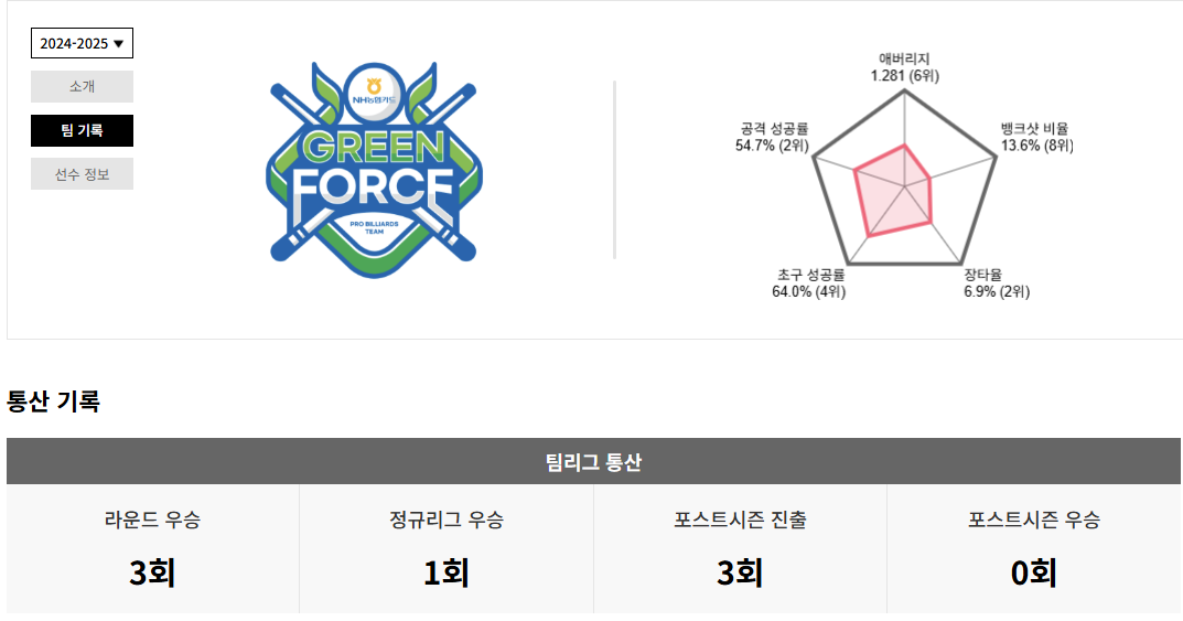 그러므로 NH농협카드 그린포스 프로당구팀 소속 선수의 나이, 프로필, 애버리지, 상금 랭킹, 우승 횟수, 종합전적 및 승률 등을 신속하게 파악할 수 있습니다.