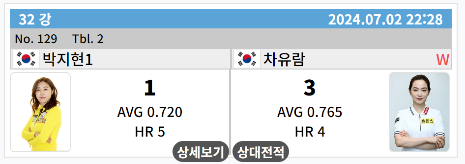 잠깐 두 선수간의 하나카드 LPBA 챔피언십 32강 대진표를 들여다보면, 박지현 선수를 이긴 차유람 선수는 우휘인 선수를 이긴 김상아 선수와 7월 4일 하나카드 LPBA 챔피언십 16강 경기를 펼칩니다.