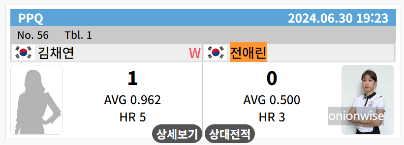 그런데 지난 개막전 오도희 선수와의 경기 결과 잔상이 남아 있었을까요? 전애린은 PPQ 라운드에서 LPBA투어에서는 무명에 가까운 김채연 선수를 만나 25:13이라는 큰 점수차로 패하면서 PQ라운드도 올라가지 못하고 탈락하고 말았습니다.