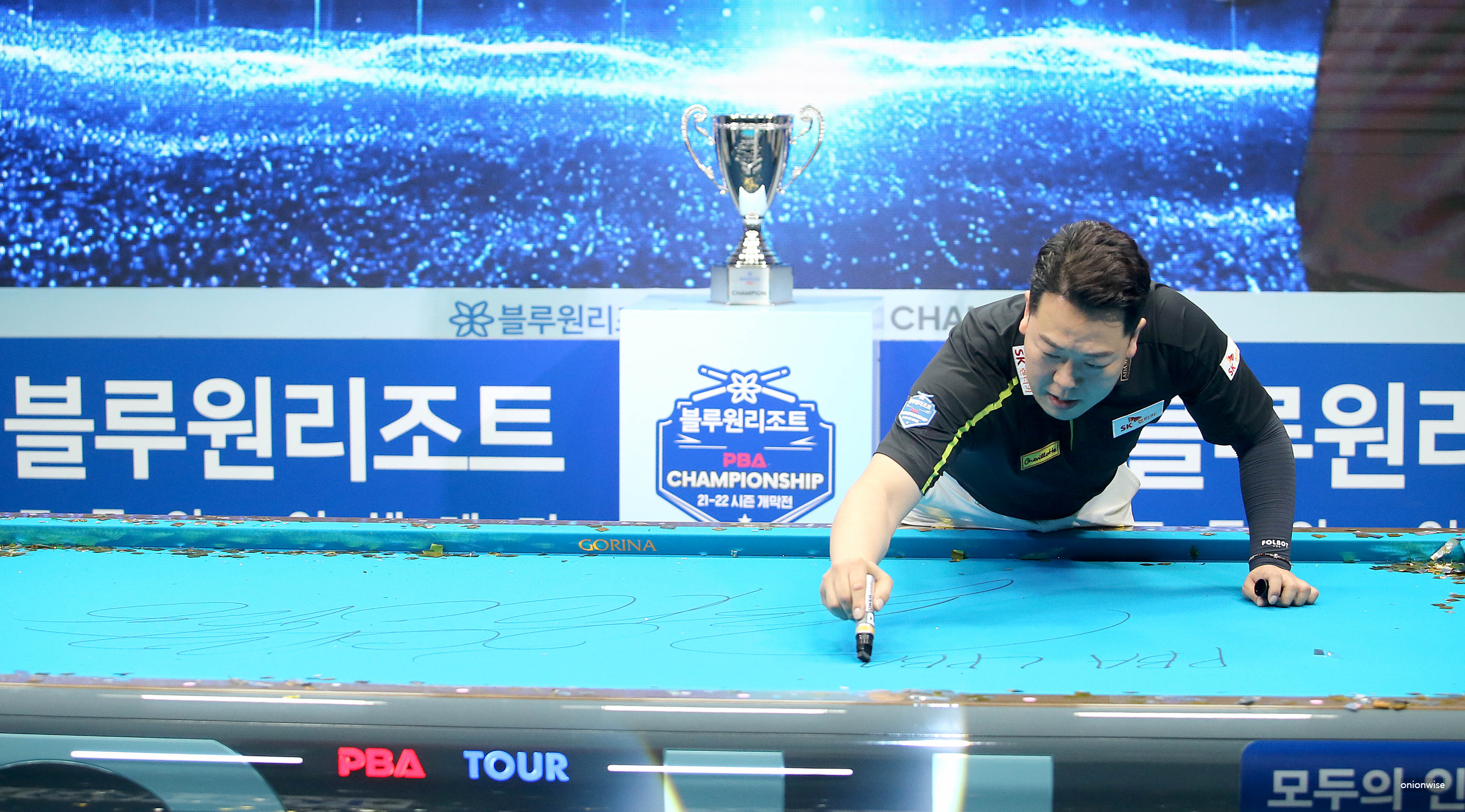 최성원 PBA챔피언은 박상일에게 세트스코어 3:0으로 완승했습니다 다. 첫 세트를 15:3(8이닝)으로 가볍게 따낸 후 2세트를 15:5(12이닝), 3세트를 15:7(10이닝)로 따내며 64강에 올랐습니다.