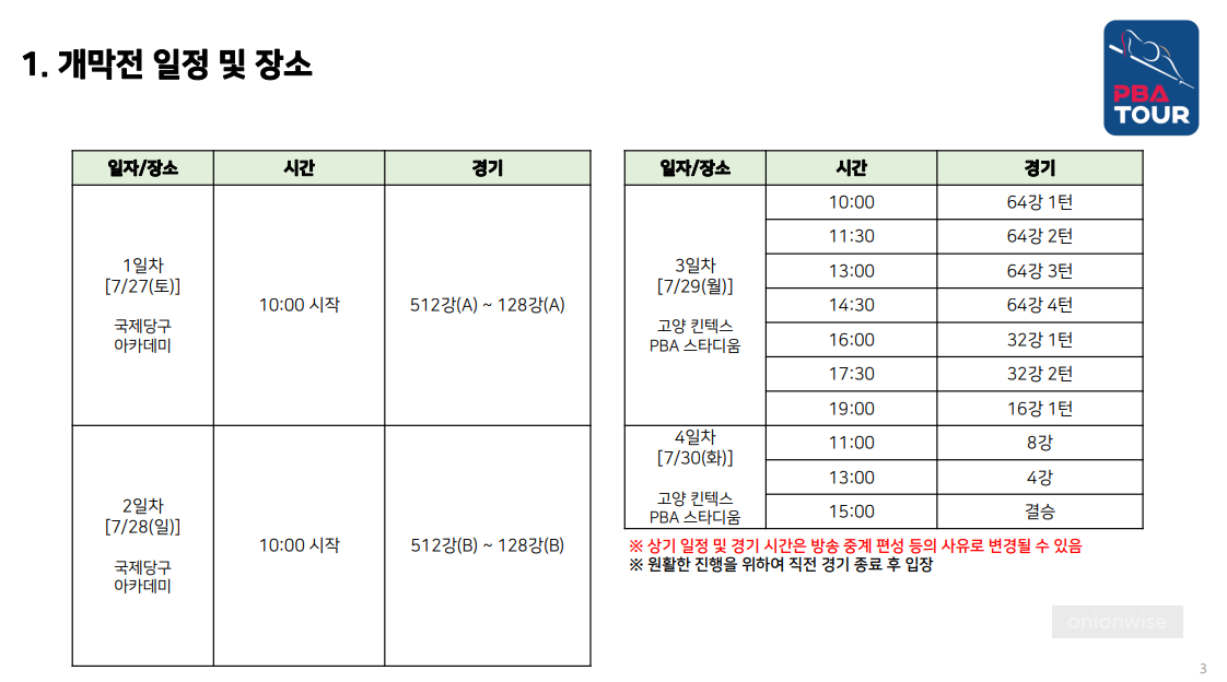 PBA 드림투어 대회일정은 개막전 - 7월 27일 ~ 7월 30일, 2차전 - 8월 3일 ~ 8월 6일, 3차전 - 8월 10일 ~ 8월 13일로 예정되어 있습니다. 각 대회의 상세 경기 시간 일정을 살펴보면,