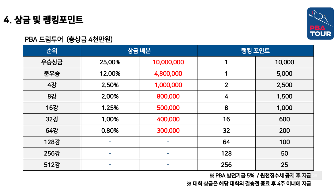 PBA 드림투어 경기결과, 128강 이하는 상금 없이 랭킹 포인트가 주어지고, 상금은 PBA 발전기금 5% 및 원천징수세가 공제되며 , 대회 상금은 해당 대회의 결승전 종료 후 4주 이내에 지급됩니다.