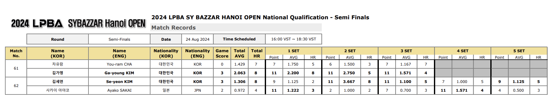 에스와이 바자르 하노이 오픈 LPBA 챔피언십 4강 준결승 경기결과, 상대 선수에게 패배하여 결승 진출이 좌절된 선수는 이번 대회 돌풍을 일으킨 차유람과 일본 여자당구선수 가운데 가장 두각을 나타내고 있는 사카이 아야코 선수입니다.