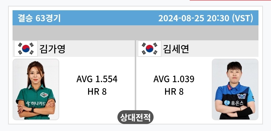 | 김가영 vs. 차유람 맞대결 전망 - 2024 에스와이 바자르 하노이 오픈 LPBA (0) | 2024.08.24 |